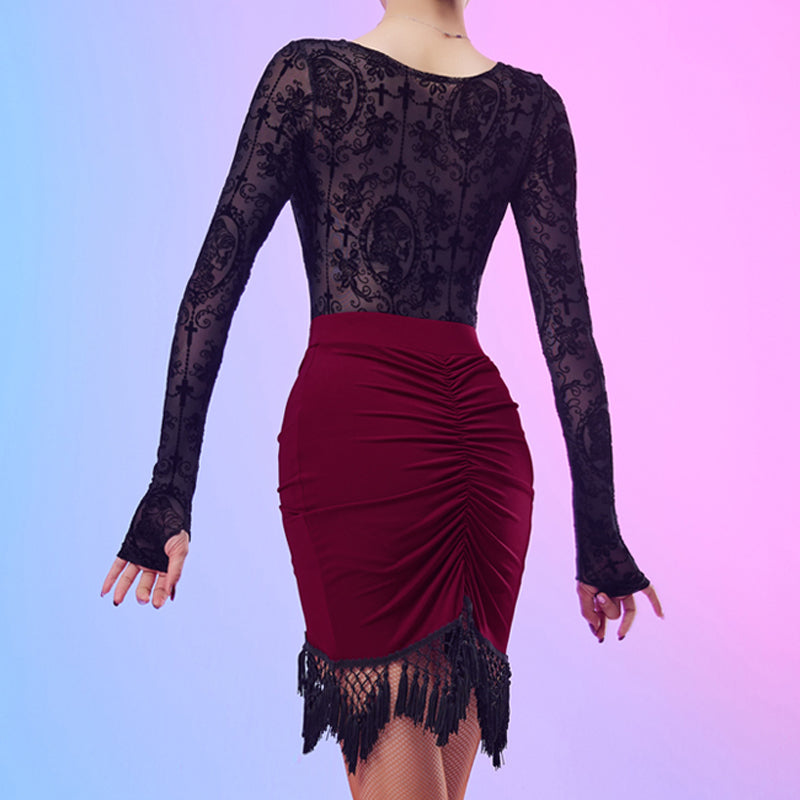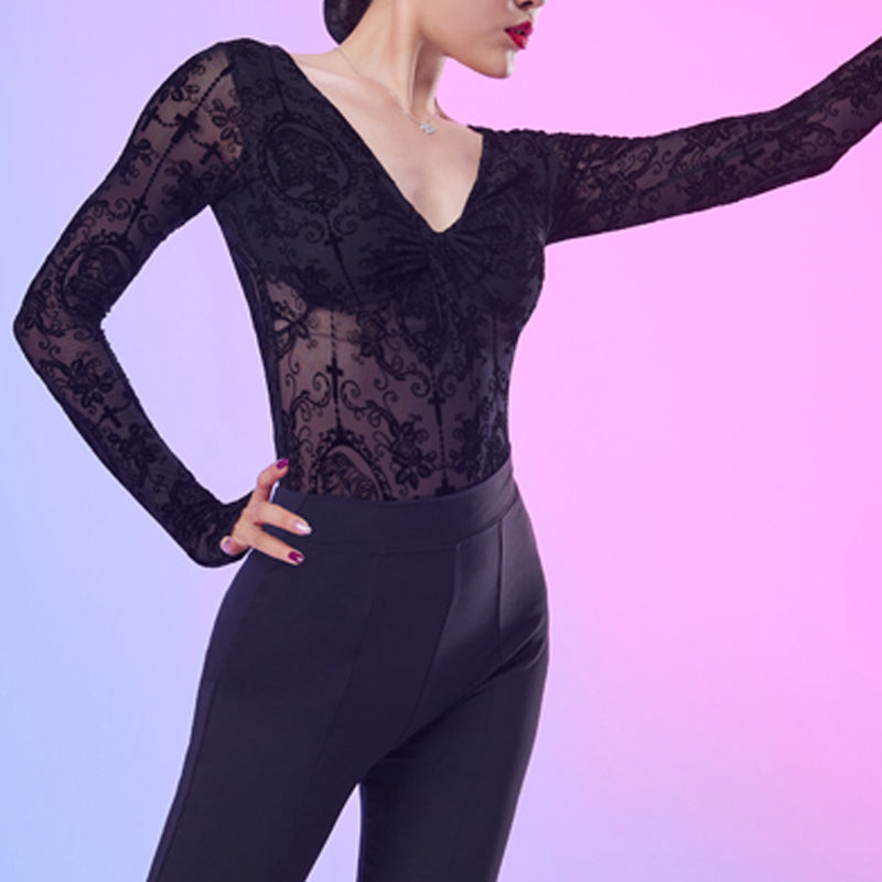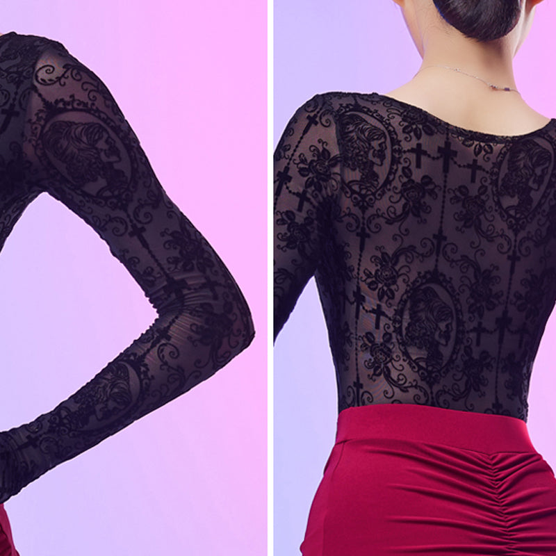 CONNY Women's Lace Long Sleeve Latin Dance Top Hollow-out Dance Bodysuit Dance Wear