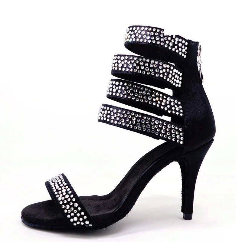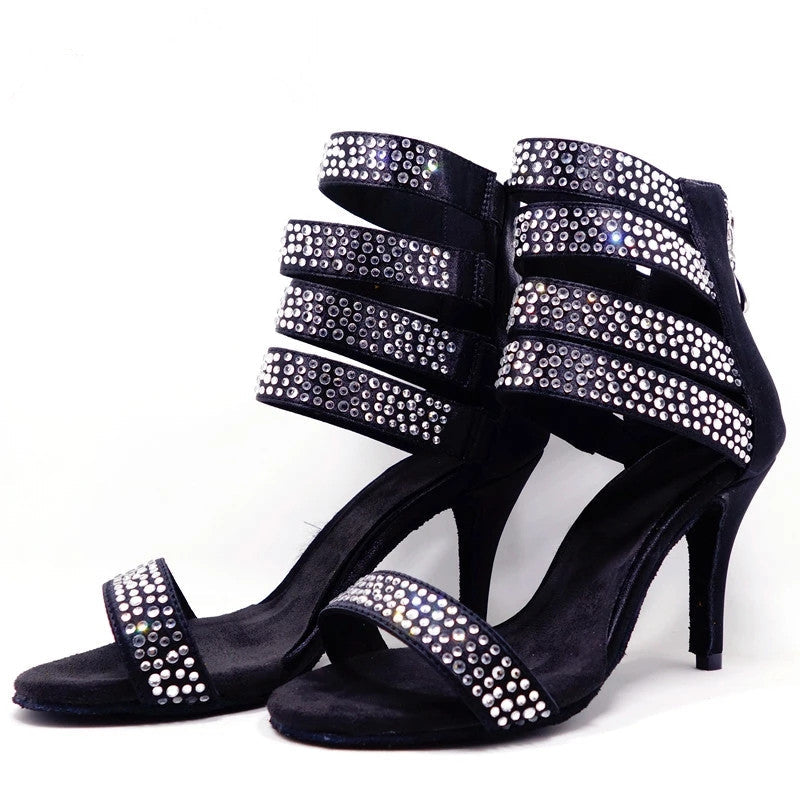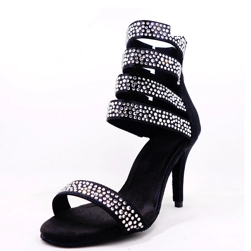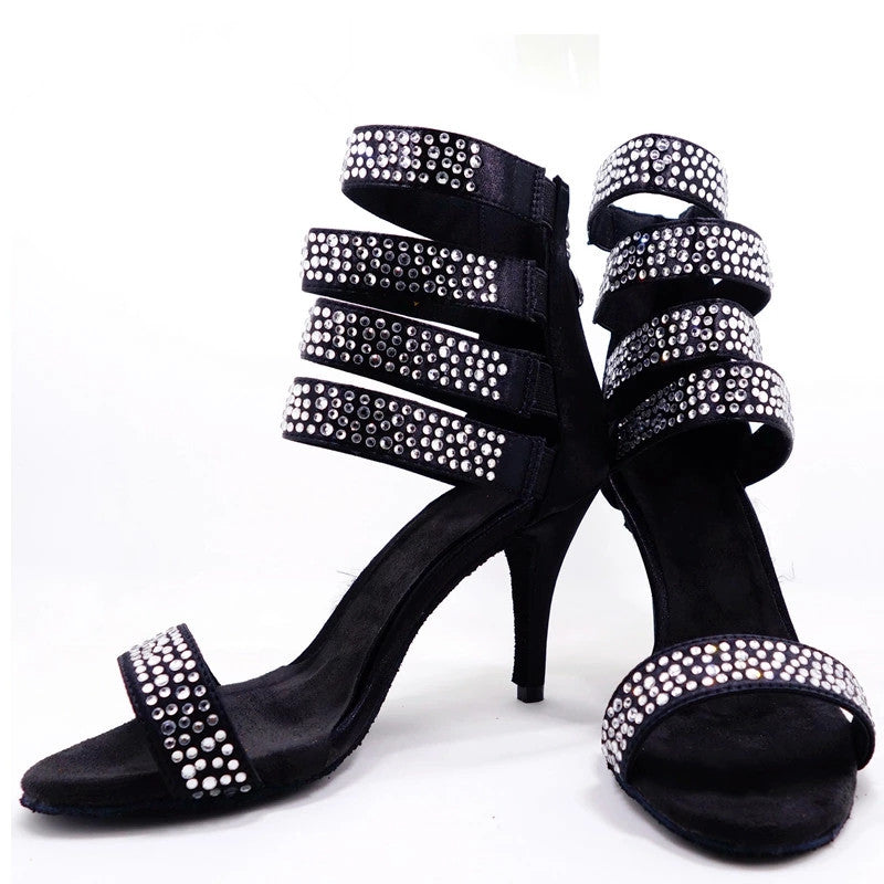 DS Women's Satin Black Rhinestone Customized Heels Dance Boots Salsa Dance Shoes