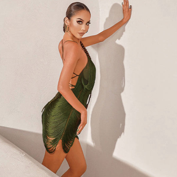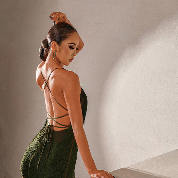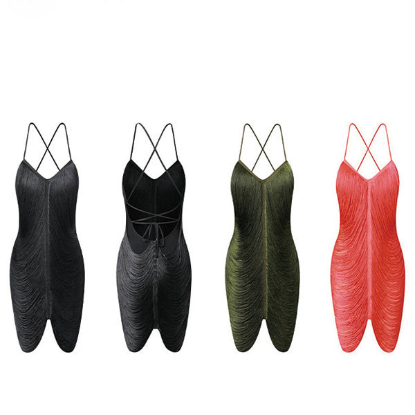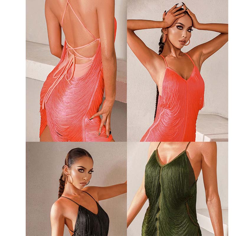Z Women's Chinlon Patchwork Tassel Latin Dance Dress Dance Wear Training Performance Dress