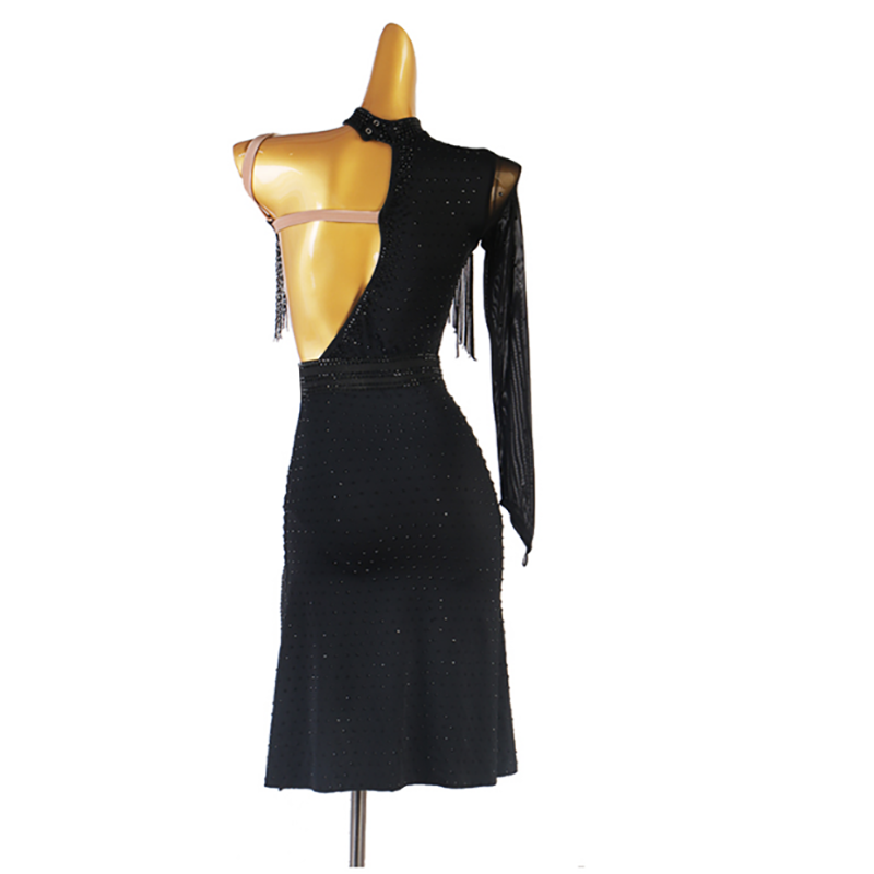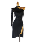 Customisable-Women's Black Sequin Tassel One-Shoulder Rumba Latin Dance Dresses Performance Dresses