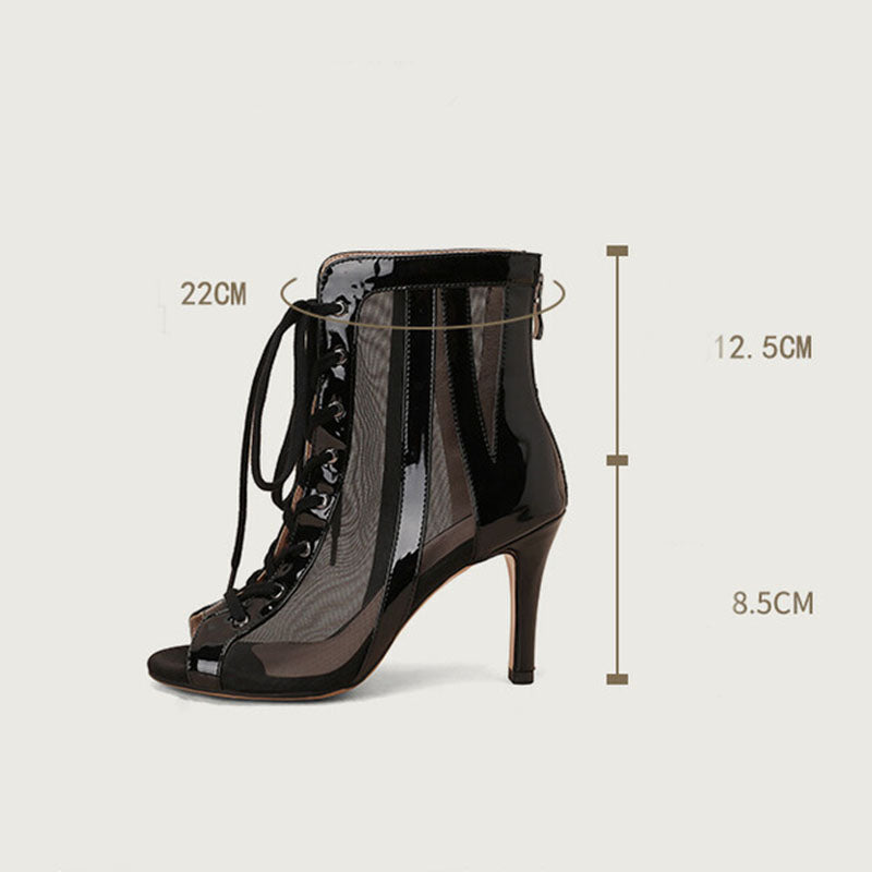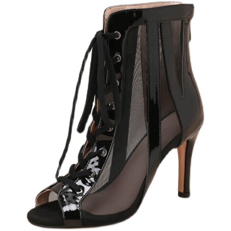 Women's Black 8.5cm Slime Heel Rubber Sole Mesh Jazz Shoes Lace-up Open Toe Dance Heels Boots