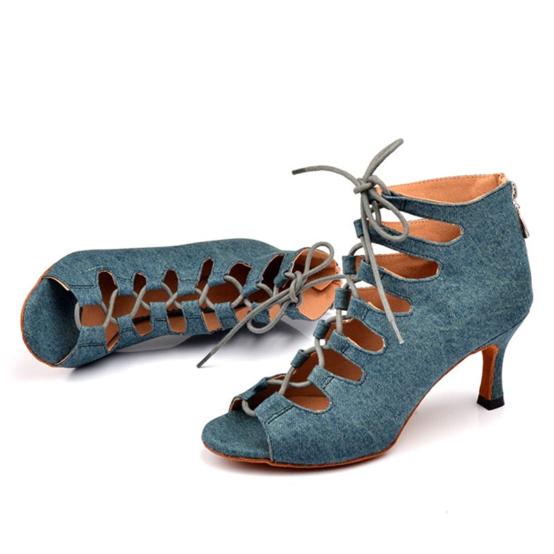 Women's Blue Denim Customized Heel Dance Boots Salsa Jazz Dance Shoes