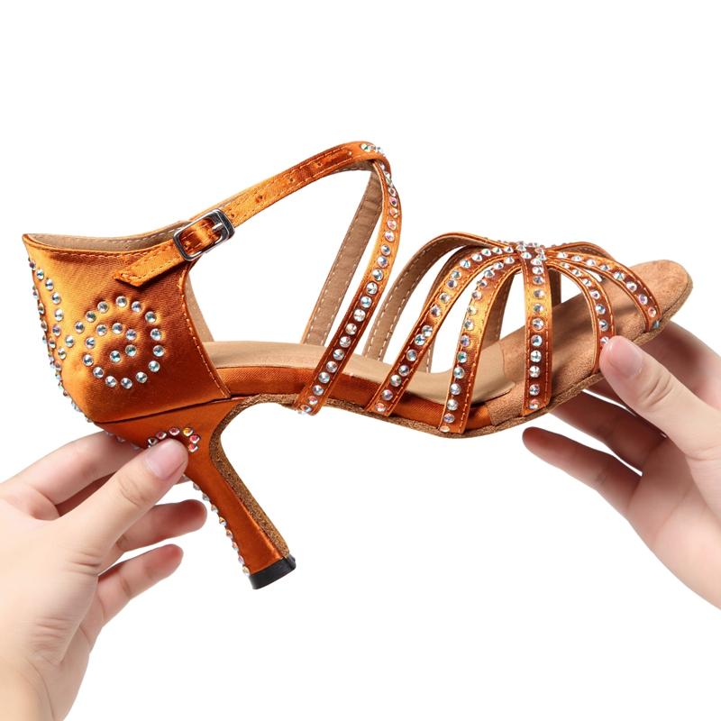 Women's Bronze Customized Heel Satin Rhinestones Strappy Latin Dance Shoes