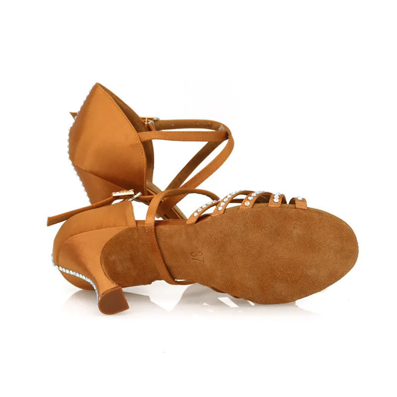 Women's Brown Customized Heel Strappy Knot Dance Shoes With Crystals Latin Dance Shoes
