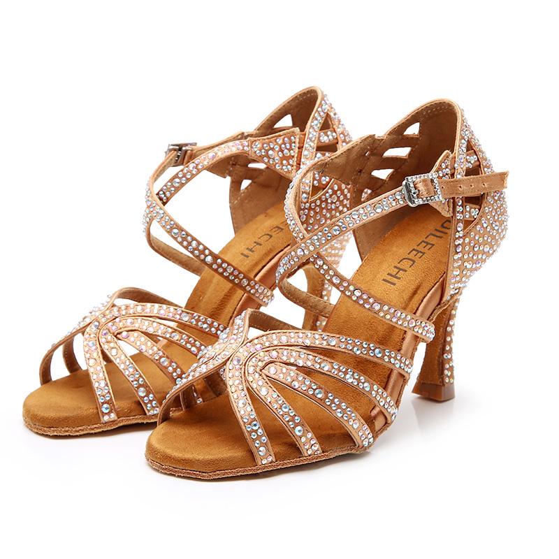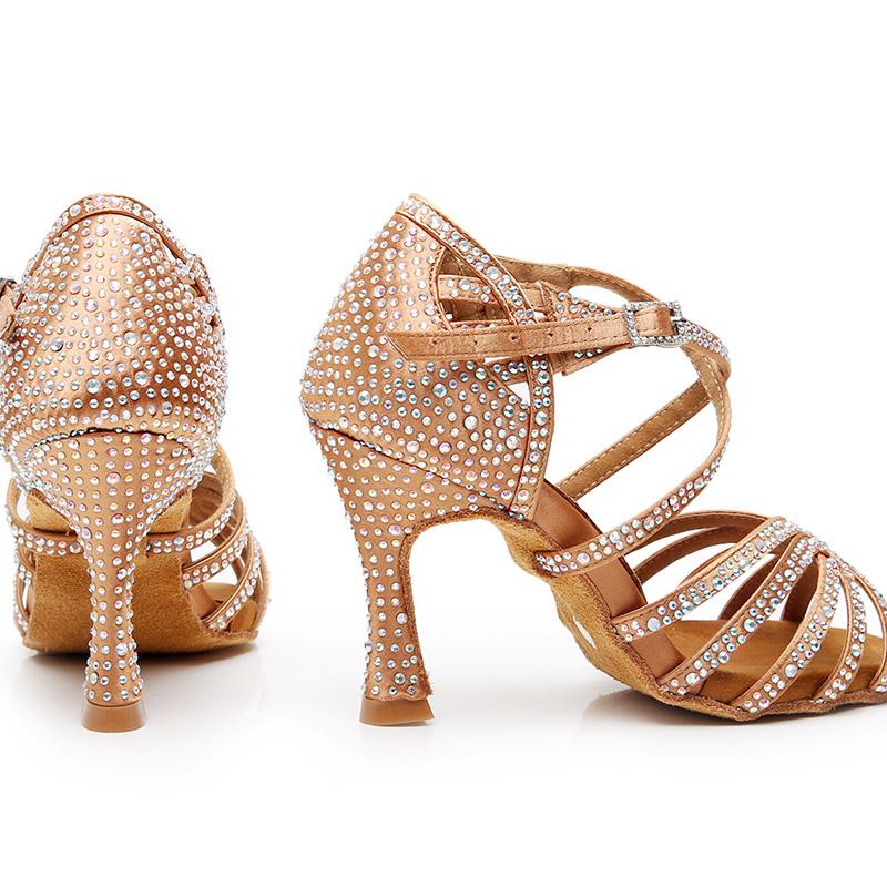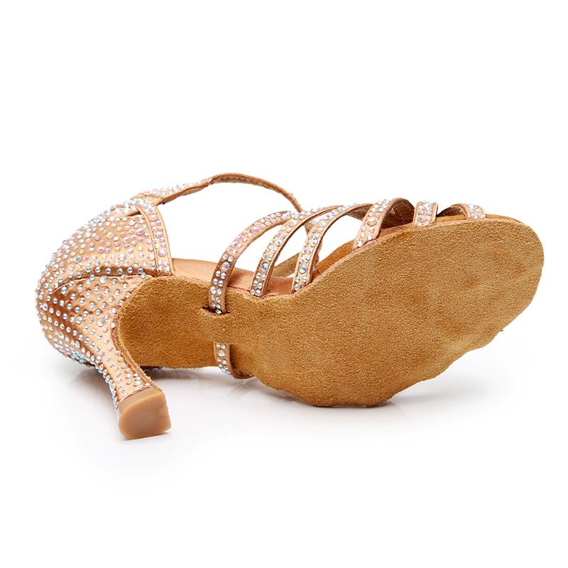 Women's Bronze Strappy Satin Rhinestones Customized Heel Dance Shoes