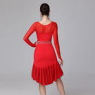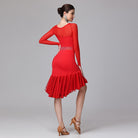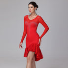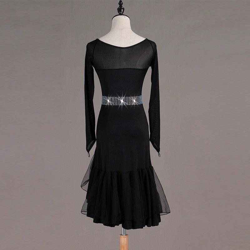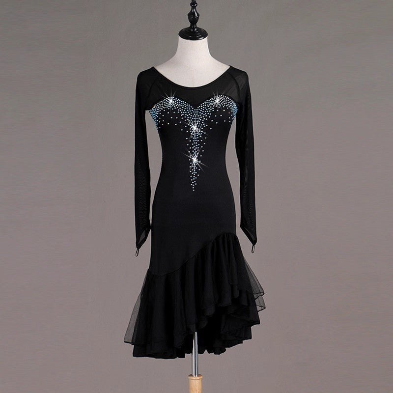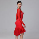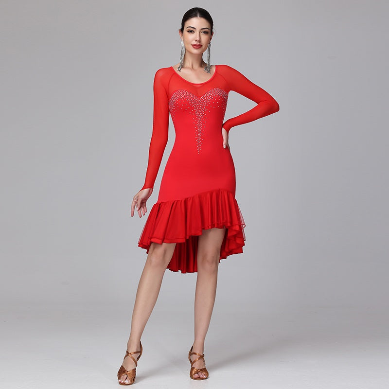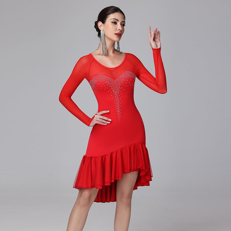 Vestido de baile latino de malla elástica personalizable para mujer, ideal para practicar rumba o para presentaciones.