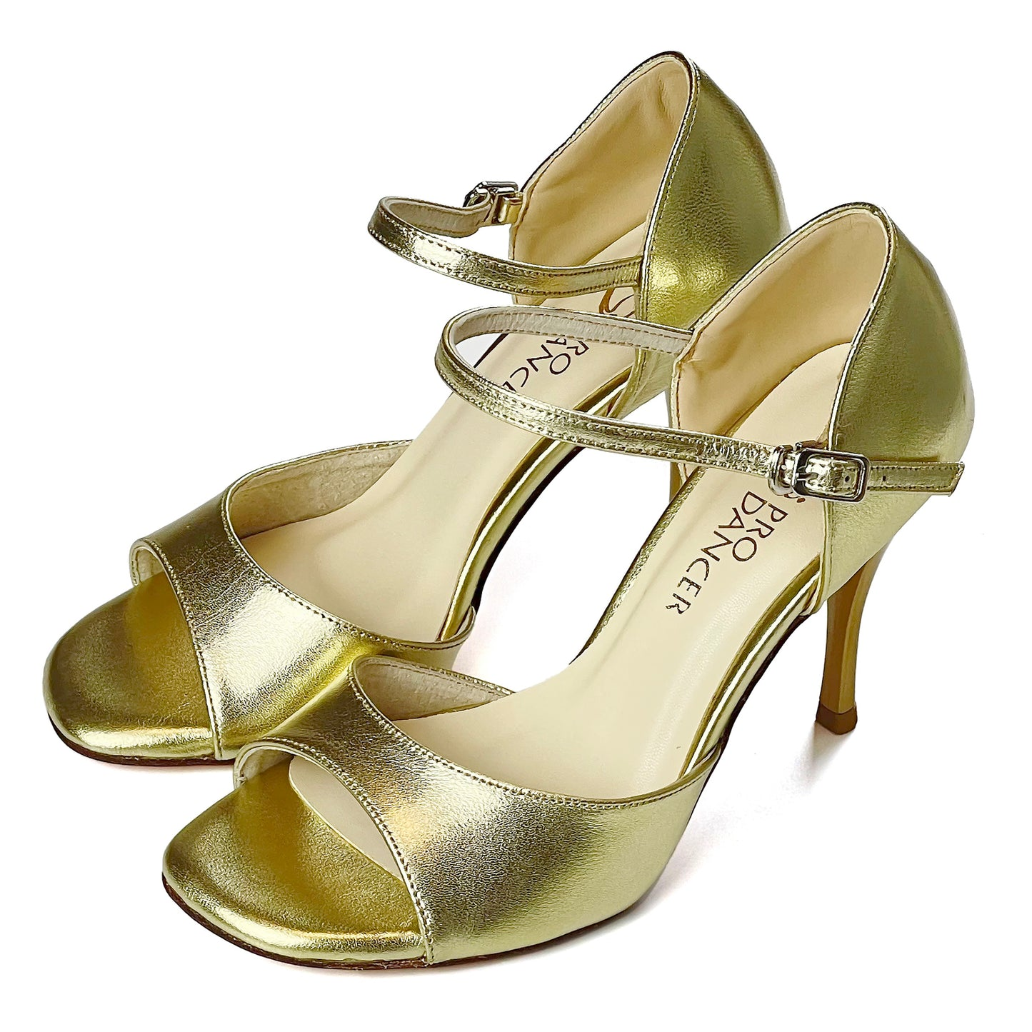 Zapatos de baile de tango SHJ para mujer, de piel auténtica dorada, con tacones de 7 cm/9 cm