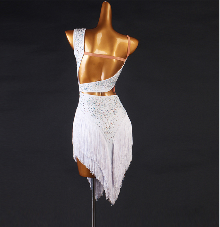 Vestido de competición de baile latino sin mangas con borlas blancas personalizable para mujer
