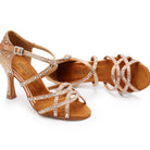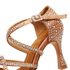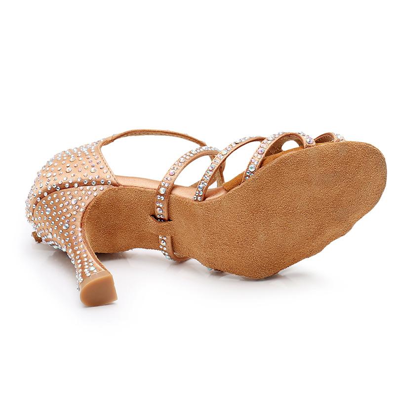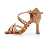 Zapatos de baile latino para salón de baile con tacones personalizados de satén y diamantes de imitación de bronce para mujer