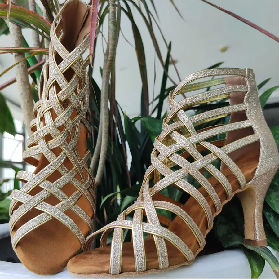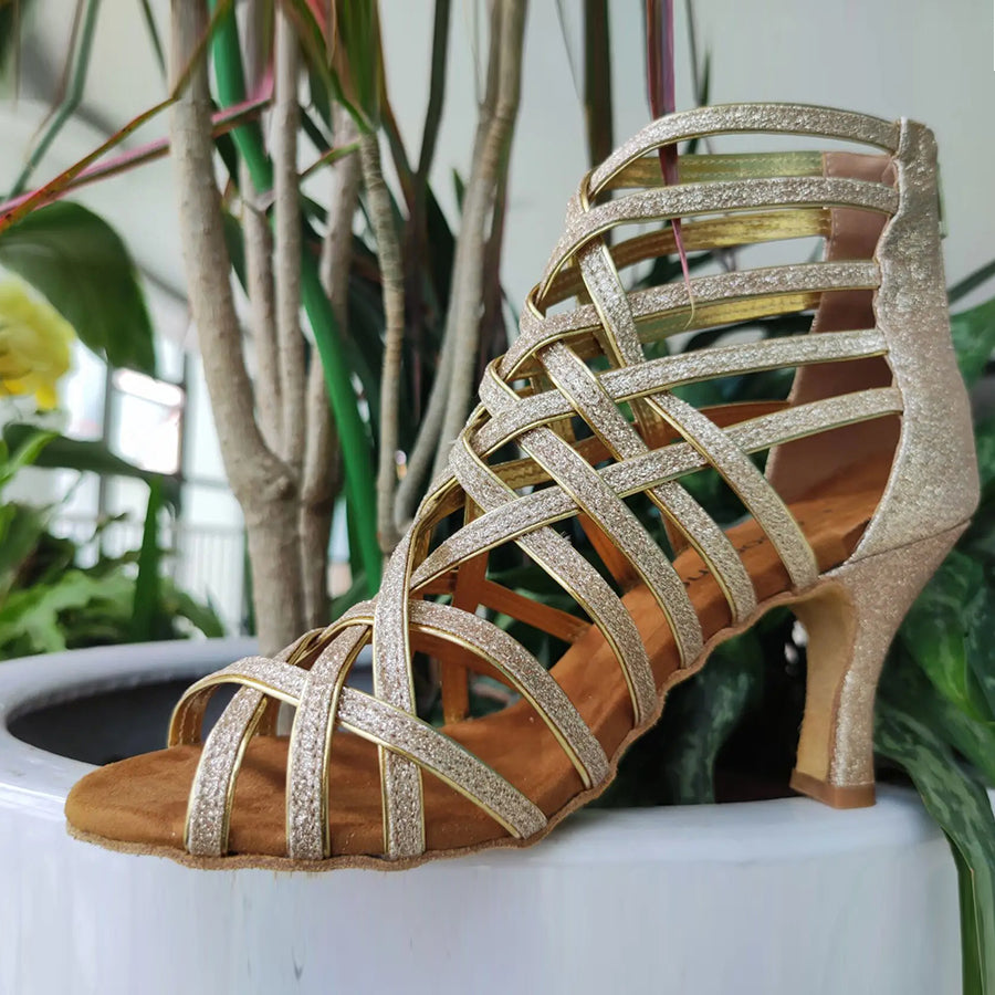 Zapatos de baile con tacón dorado personalizado y brillo brillante para mujer