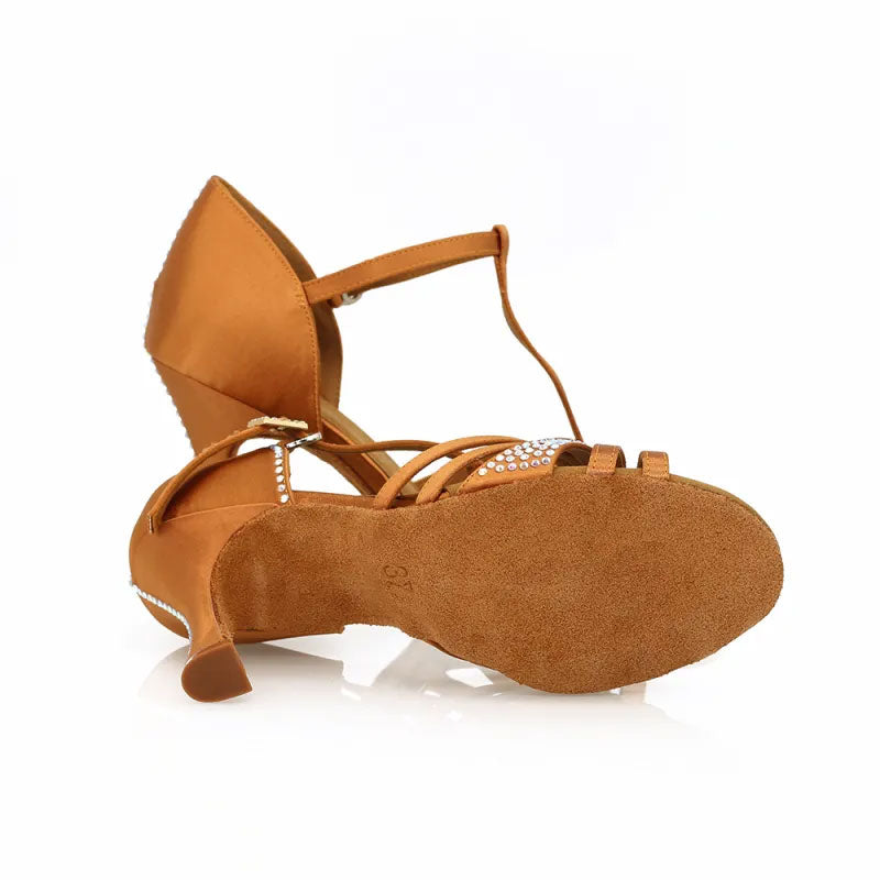 Scheroni di danza latina in raso marrone scuro semi-cristallo marrone
