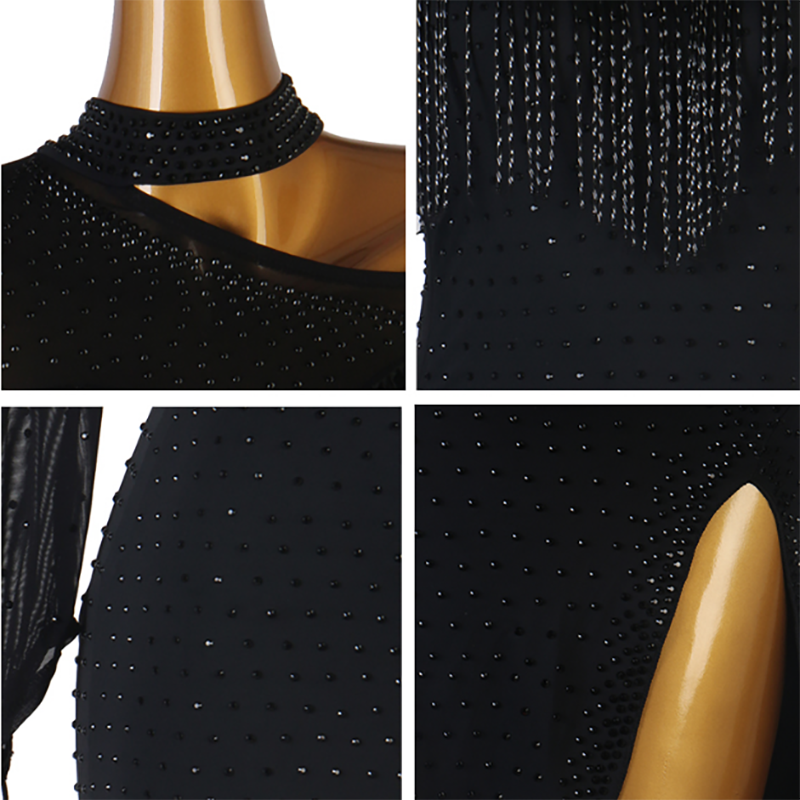 Customisable-Women's Black Sequin Tassel One-Shoulder Rumba Latin Dance Dresses Performance Dresses