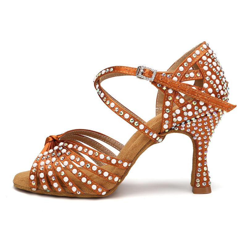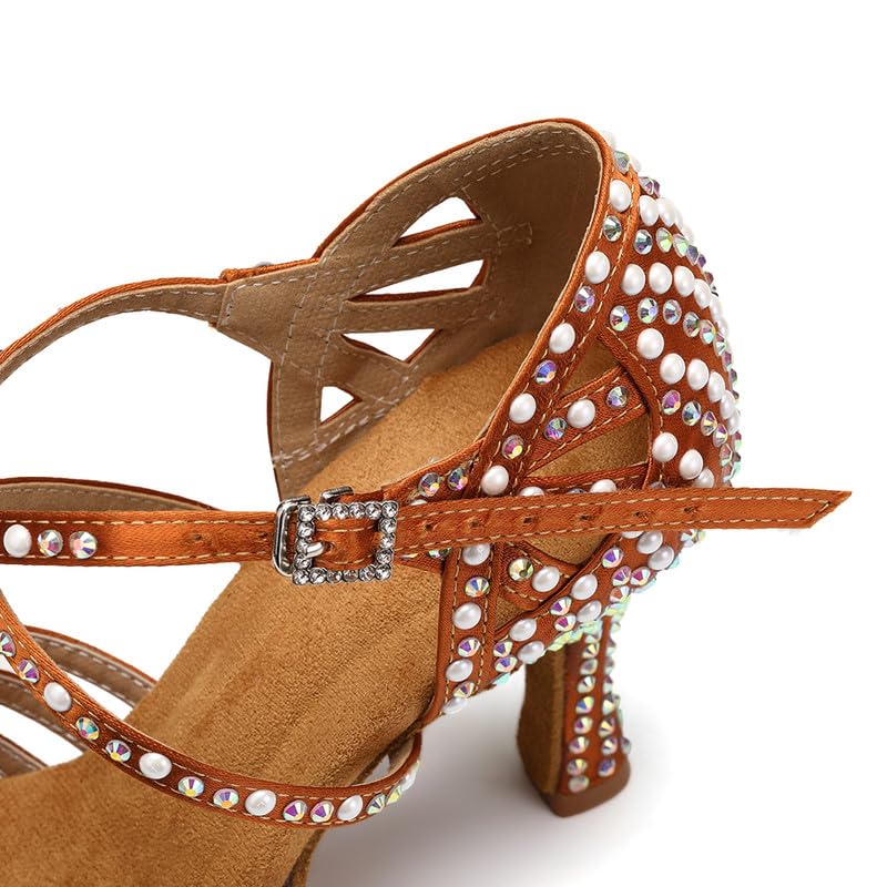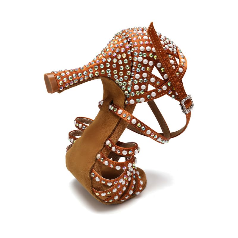 Women's Brown Rhinestone Customized Heel Satin Strappy Knot Latin Dance Shoes