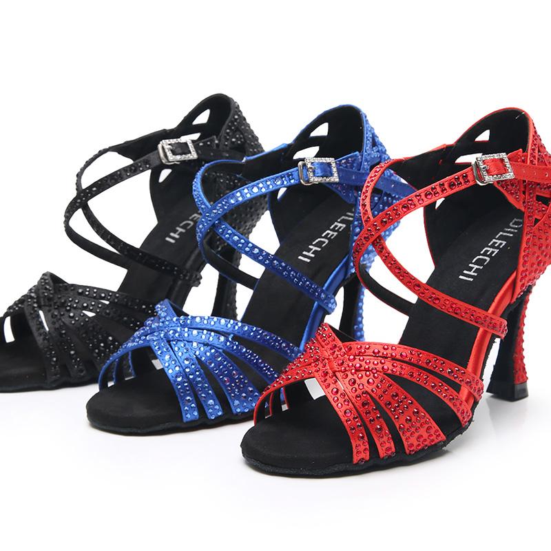Women's Blue Customized Heel Strappy Dance Shoes With Crystals
