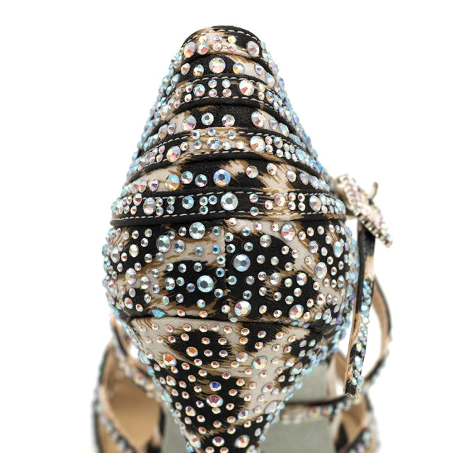 Women's Leopard 9cm Heel Strappy Satin Rhinestones Sandal Latin Dance Shoes